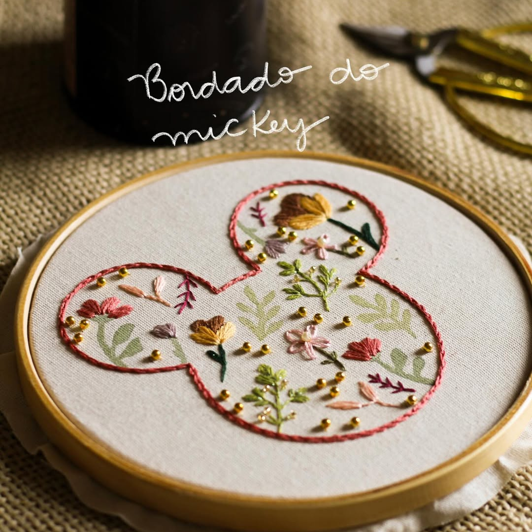 No risco Mickey Mouse Florido, o clássico ganha um toque delicado e poético. Um desenho que une nostalgia, alegria e a suavidade das flores, perfeito para criar peças cheias de charme, afeto e personalidade.